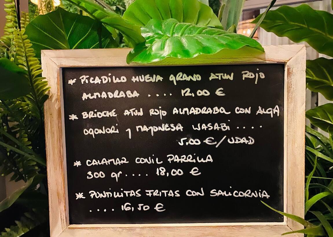 Su especialidad es el atún rojo de almadraba, llegando a existir un apartado en la carta referido a este producto. Otras secciones presentes en su menú, son los postres caseros y los vinos de la provincia.